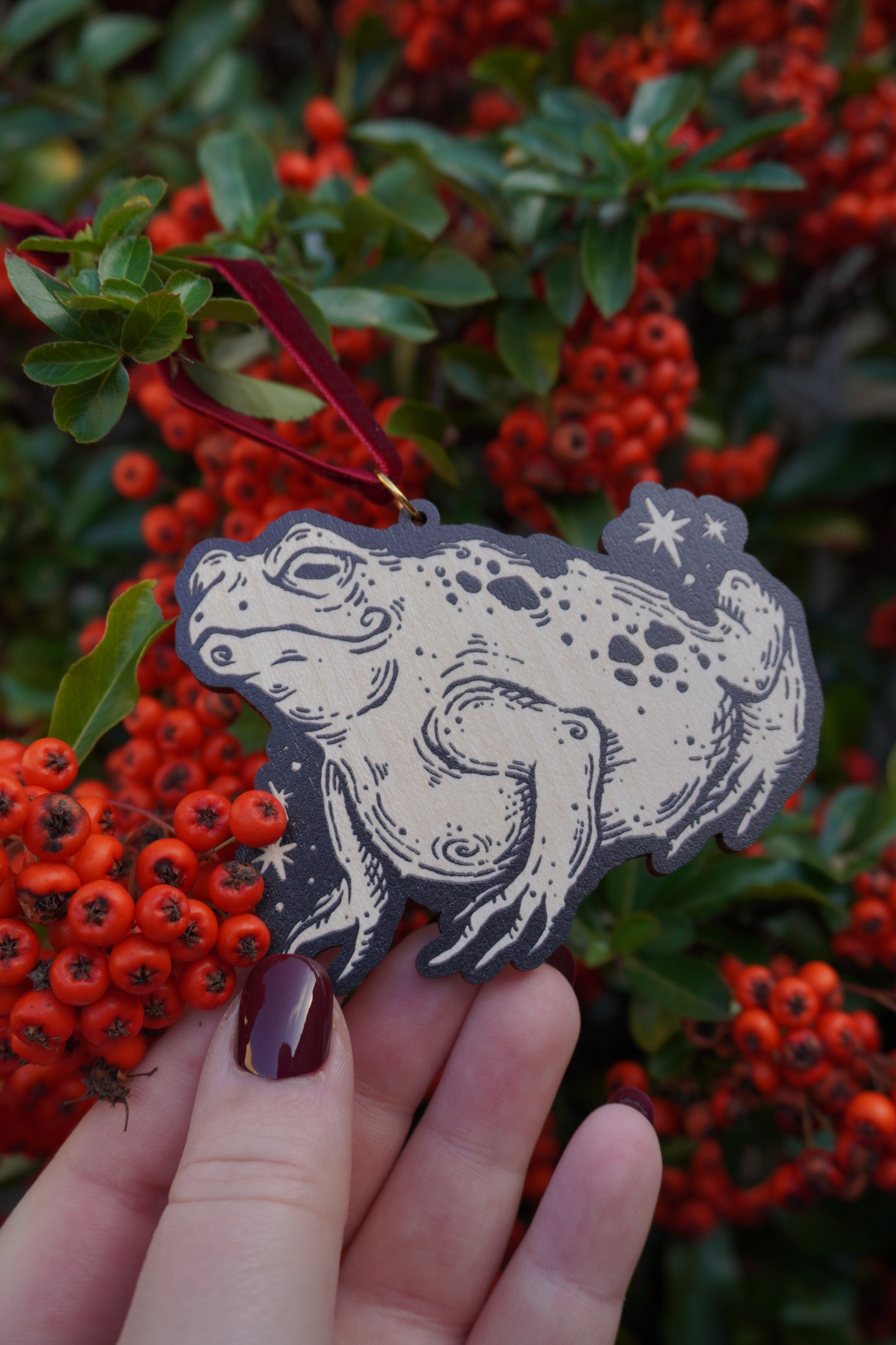 Made using responsibly sourced Maple Veneered MDF, each ornament comes with a jump ring and burgundy velvet ribbon. Makes a wonderful gift for fellow Toad lovers!